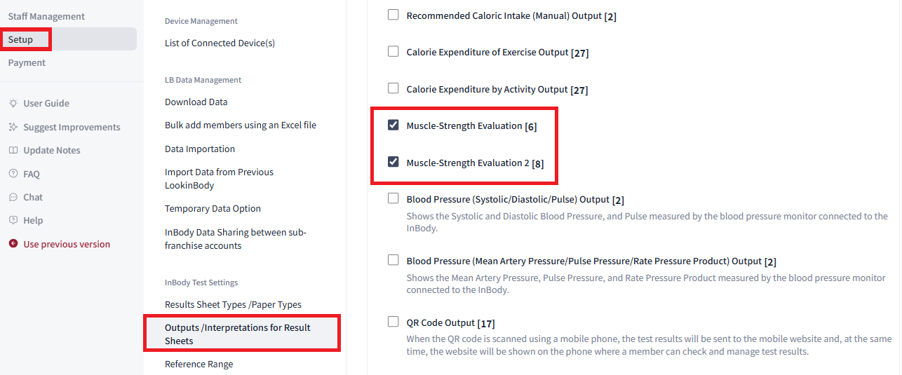 - You also want to make sure the output is enabled from your Setup Menu. This can be found under 'Setup' -> 'Outputs/Interpretations for Result Sheets' -> 'Muscle-Strength Evaluation'