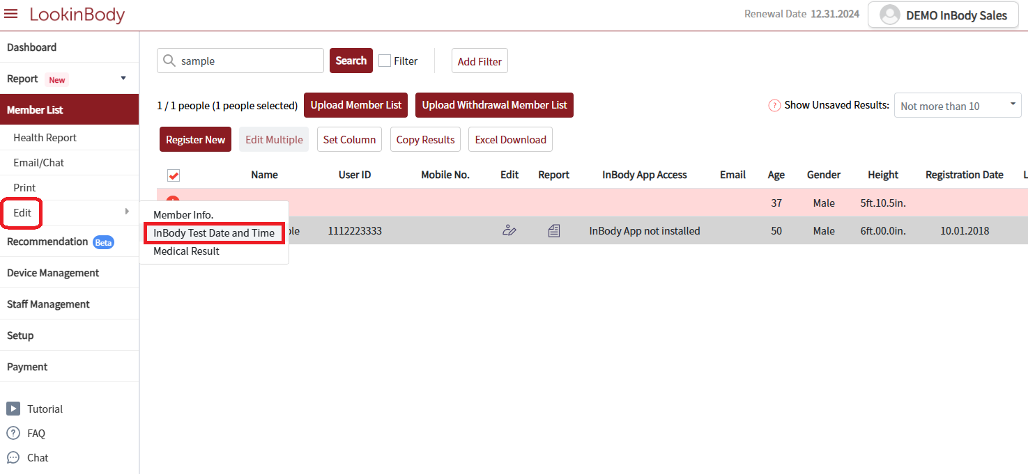 - Select 'Edit' and select 'InBody Test Date and Time'